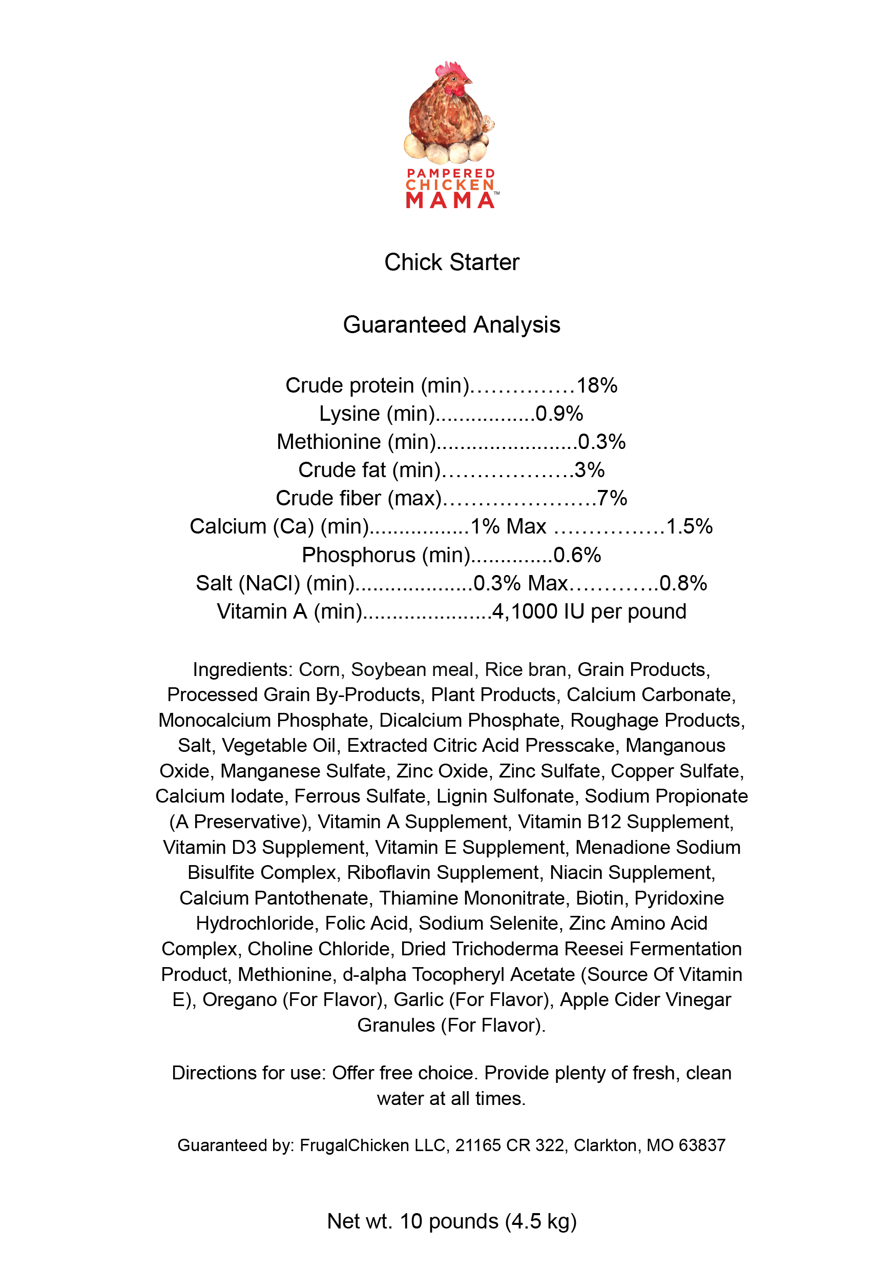 Pampered Chicken Mama Whole Grain Herbal Non-GMO Chick Starter is 18% protein, and has all the nutrients your chicks need to be healthy.